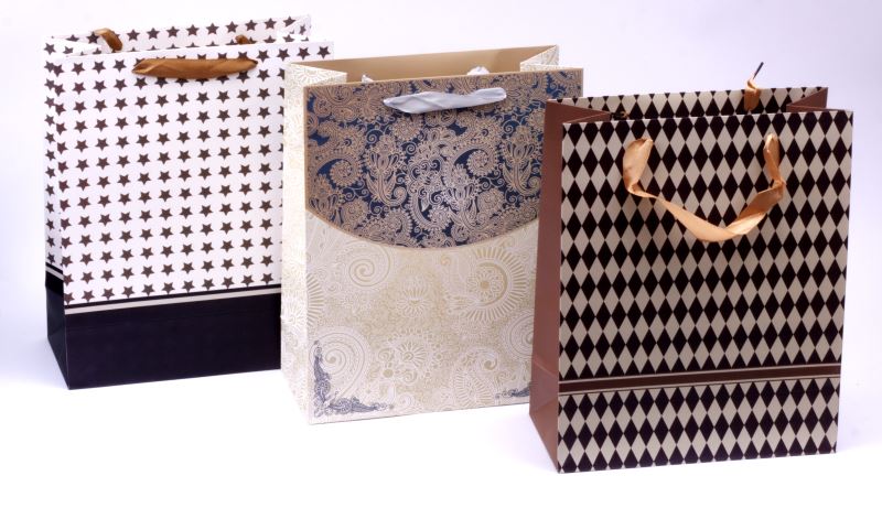 Papírová dárková taška s textilními uchy. Balení po 12 ks. Mix 3 motivů.