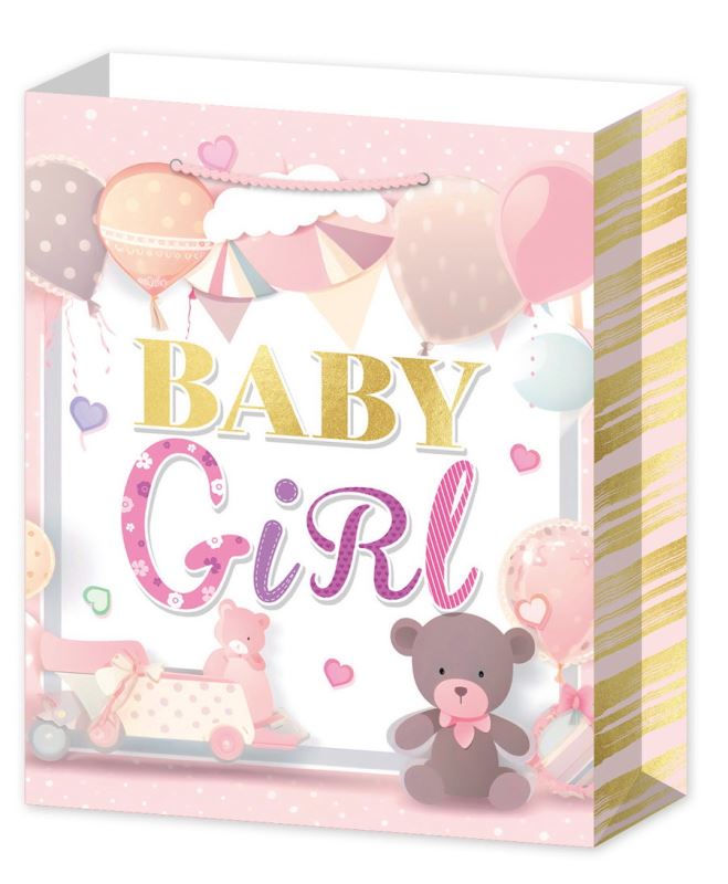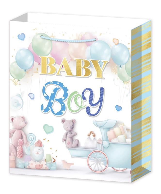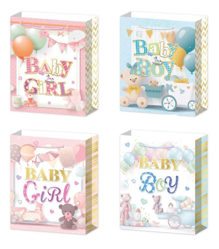 Dárková papírová taška pro novorozené děti, kluky i holky, Baby Boy a Baby Girl, modré a růžové, mix 4 motivů viz obrázek. Pevný materiál 210g, laser tisk.
