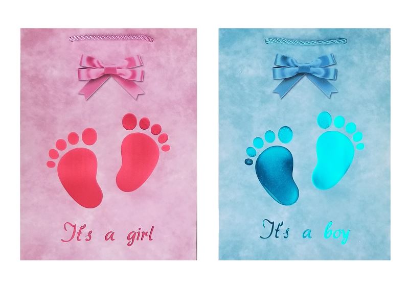 Papírová dárková taška, mix 2 druhy, pro kluky It´s a boy, pro holky It´s a girl, krásné laserem tištěné provedení, barvy růžová a modrá. Pevný materiál 210g, kroucené provázkové úchopy.