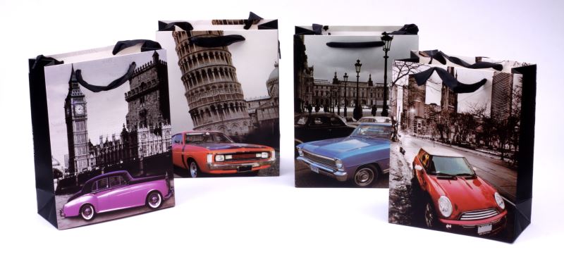 Papírová dárková taška s textilními uchy. Balení po 12 ks. Mix 4 motivů.