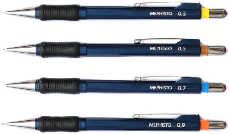 Výrobek se používá jako mechanická tužka pro běžné psaní. Mechanická tužka MEPHISTO. Mix barev pláště: černá, červená, modrá. Gumový úchyt. Gumička. Průměr cca 10 mm, délka 150 mm. Kovový klip. Součástí je grafitová tuha průměr 0,7, gradace B.