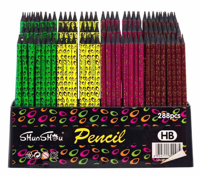 Grafitové tužky HB s gumou, černé dřevo, mix barev a laser potisku, balení 288ks, cena za 1ks.