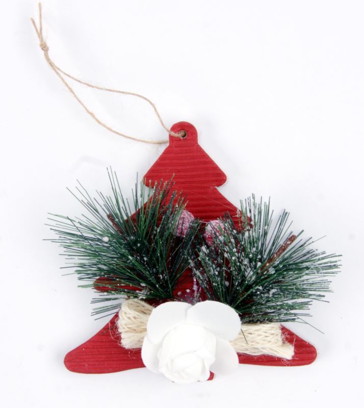 Kartonový vánoční stromek se zdobením a závěsem. Barva červená.