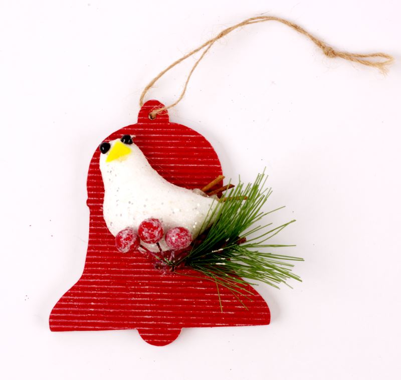 Kartonový vánoční zvoneček se zdobením a závěsem. Mix barev: bílá, červená, natur.