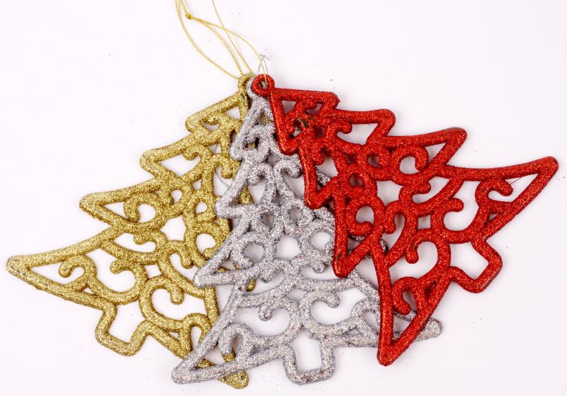 Dekorační vánoční stromeček, glitrovaný, 3 barvy: zlatá, stříbrná, červená. Balení 3ks, cena za celé balení.