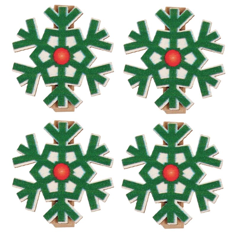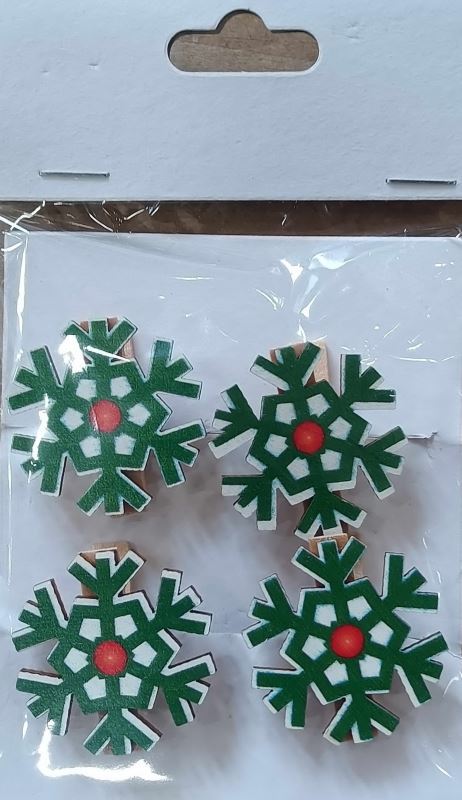 Vánoční dřevěné kolíčky s dřevěnými vločkami, 3,5cm, vhodné k vánočnímu tvoření a dekorování. Tradiční barvy. Cena za celé balelní 4ks.