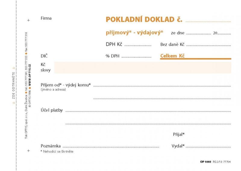 Možné použít jako příjmový nebo výdajový pokladní doklad, samopropisovací, nečíslovaný, formát A6 na šířku, obsahuje 100 listů,tržitelných perforací, se zakládacím děrováním.