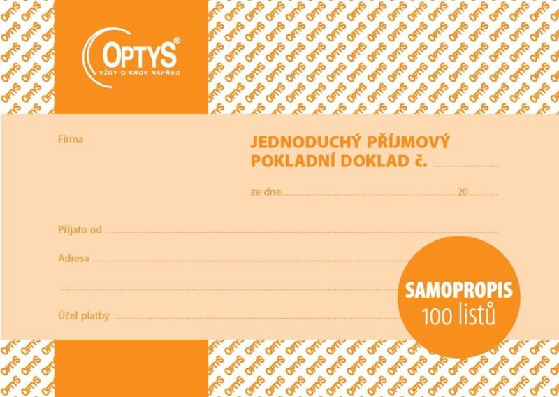 Samopropisovací, nečíslovaný. Formát A6 na šířku. Obsahuje 100 listů odtržitelných perforací, se zakládacím děrováním.