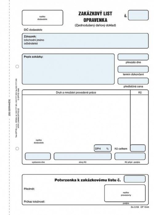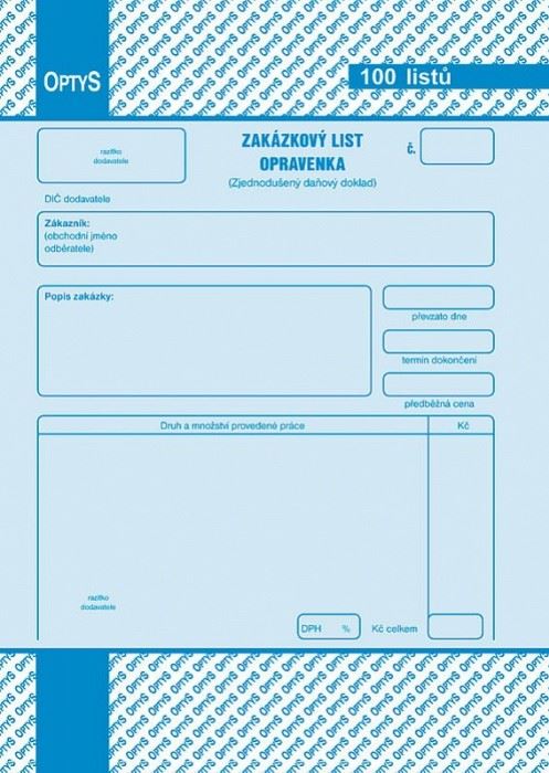 Zakázkový list A5 opravenka OP 1048. Nepropisující tiskopis. Blok 100 listů. Formát A5 na výšku. Modrá obálka. Nečíslovaný.