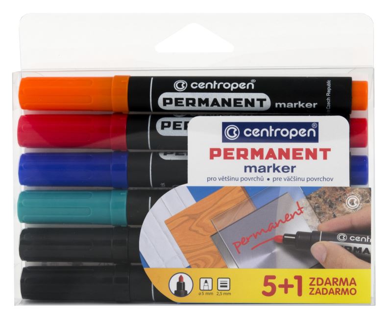 Permanentní značkovač na většinu povrchů (papír, guma, plast, kůže..) odolný vodě a těplotě do 100°C, alkoholová báze, válcový hrot, šířka stopy 2.5mm.
